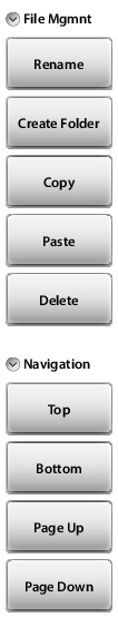 ![]() | File Mgmnt Rename Press this submenu key to rename a selected file or folder. The current name is displayed for editing or appending. Press Save or Enter to complete. Create Folder Press this submenu key to create a new folder in the highlighted location or folder. Name the new folder with the onscreen keyboard and press Save. Copy Press this submenu key to mark the selected files and/or folders for copying or moving, using the Paste command. Use the checkbox column to select multiple items to copy or move. Paste Press this submenu key to paste the selected files and/or folders to the destination location. In the message box that appears (see Figure: Paste Selection Dialog Box), press Paste to create duplicate copies in the destination folder; press Move to place copies in the destination folder and remove the selected files from the source location. If files or folders with the same name already exist in the destination location, the Site Master asks you to confirm that the existing files should be overwritten. Delete Press this submenu key to delete the files and/or folders that are selected. Only files or folders from one location can be deleted at a time. Use the checkbox column to select multiple items to delete. Once an item is deleted, it cannot be recovered. Navigation Top Press this key to navigate to the top item of the current location. Bottom Press this key to navigate to the bottom item of the current location. Page Up Moves up one screen of items (7 rows) in the current location. Page Down Moves down one screen of items (7 rows) in the current location. |