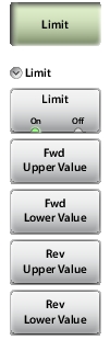 ![]() | Limit Limit Turns the limits On or Off. Fwd Upper Value Sets the forward measurement upper limit (displayed as red hash marks). Enter the desired number by using the keypad, the rotary knob, or the Up/Down Arrow keys. If the keypad was used to enter new values, then press Enter to set the new setting or press the Esc button to restore the previous setting. Fwd Lower Value Sets the forward measurement lower limit (displayed as red hash marks). Enter the desired number by using the keypad, the rotary knob, or the Up/Down Arrow keys. If the keypad was used to enter new values, then press Enter to set the new setting or press the Esc button to restore the previous setting. Rev Upper Value Sets the reverse measurement upper limit. Enter the desired number by using the keypad, the rotary knob, or the Up/Down Arrow keys. If the keypad was used to enter new values, then press Enter to set the new setting or press the Esc button to restore the previous setting. Rev Lower Value Sets the reverse measurement lower limit. Enter the desired number by using the keypad, the rotary knob, or the Up/Down Arrow keys. If the keypad was used to enter new values, then press Enter to set the new setting or press the Esc button to restore the previous setting. |