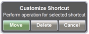 User‑defined shortcuts stay in memory until deleted. To delete or move a shortcut button, press the Menu key, then press and hold the shortcut until the Customize Shortcut dialog box (Figure: Customize Shortcut) appears. This dialog box provides options to delete or move the shortcut. If Move is selected, then a green rectangle outlines the shortcut button. Touch the new location where the button is to be placed. If the location is empty, then the outlined button moves there. If the location contains a button already, then the two buttons swap locations.