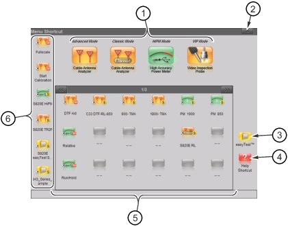 Press the Menu key to open the Menu screen. Select the desired operating mode by touching one of the large mode icons in the top row or by touching one of the user‑created shortcuts below. User‑created shortcuts may include measurement setups, submenu key, or easyTest Tools scripts. Shortcuts can be added, deleted, or moved as described below.