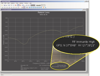 3. | GPS icon. Press to view the current GPS information (Figure: GPS Info) obtained from an external USB‑based GPS module. The icon indicates the status of the GPS module and location fix. After capturing a good fix, location data are saved with measurements (Figure: Location Data Saved in Measurement File) and screen captures. GPS status icon states: a. GPS module (H/W) is not connected. Connect an Anritsu approved GPS module. b. H/W connected without a current location fix. Module attempts to establish a location fix during this state. c. H/W connected with a current location fix. d. H/W not connected, instrument using last saved location fix. Pressing Reset button places GPS in state “a.” e. H/W connected, GPS fix lost, using last saved location fix. Pressing Reset button places GPS in state “c.” |