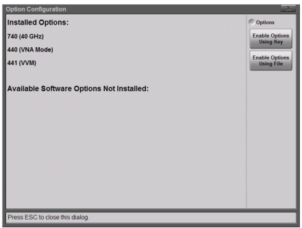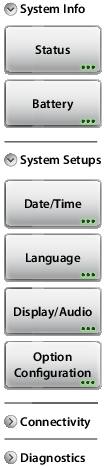 ![]() | System Info Status Press this submenu key to display the Status Menu including detailed instrument, hardware, software and connectivity information. Battery Press this key to display the battery charge remaining and charge status. System Setups Date/Time Press to display the Time and Date Menu. Language Press to set the default language. Options include: English, French, German, Italian, Spanish, Russian, Portuguese, Japanese, Korean, or Chinese. Display/Audio Press this submenu key to display the Display/Audio Menu, which includes display, screen shot, and volume settings. Option Configuration Press this submenu key to see a list of installed options and also any available software options. To enable new options, enter the Option Key or the file that is provided by Anritsu Customer Service. Refer to Option Configuration Dialog Box. |