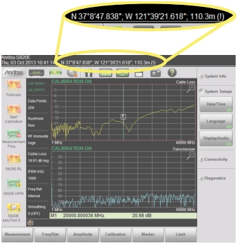 Note | An exclamation mark (!) is appended to the GPS location data in screen captures when the instrument is using Last Fix instead of current GPS information. |