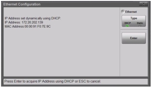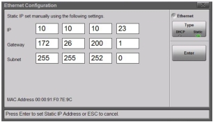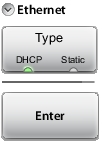 ![]() | Ethernet Type: Press this key to select the type of IP Address setting: DHCP or Static. When set to DHCP, the instrument dynamically sets the IP Address and displays it, as shown in Figure: Ethernet Configuration Dialog - DHCP. When set to Static, the user must manually enter the IP, Gateway, and Subnet addresses, as shown in Figure: Ethernet Configuration Dialog - Static. The settings are saved once the Enter button is pressed. |