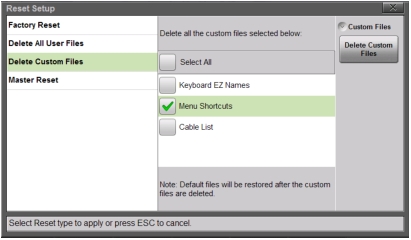 ![]() | Delete Custom Files: Select the custom files to delete including keyboard EZ names, menu shortcuts, and custom cable types (see Figure: Delete Custom Files). Use the touchscreen to select the custom file types to delete and press the Delete Custom Files button and then press Yes to confirm. Master Reset: In addition to the functions described in Factory Reset above, all user files in the internal memory and all custom files are deleted (see Figure: Master Reset). Press the Master Reset button to initiate the Master Reset and reboot the instrument, then press Yes to confirm. Update Firmware Press this submenu key to update the instrument operating system with a USB flash drive. Follow the on screen instructions to update the firmware. Refer to Updating the Site Master Firmware for additional information. |