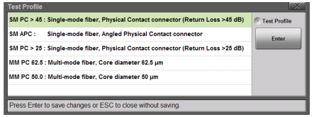 3. Press the Test Profile key to open the selection box. Use the rotary knob or the Up/Down arrow keys to highlight the desired profile, then press Enter to save the setting.