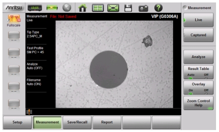 Once the Video Inspection Probe is properly connected and you have started the VIP application on the Site Master, a live view of the optical fiber endface should display on the instrument screen. See Figure: VIP Image Live View.