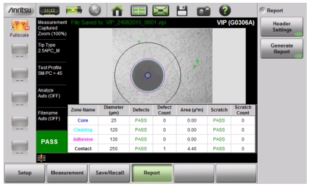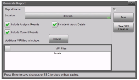 You can output the captured VIP image and analysis results to a PDF-formatted file, using the Report main menu key. The report may include current or previously saved data, or both.