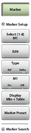 ![]() | Marker Setup Select (1–8) M# Press to turn on a marker (1 to 8) and selects which marker is active (green half circle). Current active marker is displayed on the button (M1). Edit Press to change the position of the active marker using the Up/Down Arrow keys, rotary knob or the keypad. Type Sets the current active marker as a reference (standard) marker or a delta marker relative to Marker 1. Marker 1 is always a reference marker. M1 (On Off) Toggles the display of the active marker (M1 through M8) On or OFF. When off, the location of the marker is stored. Display (Mkr + Table, Mkr Only, Off) Press to see display options. Mkr+Table: Displays both the markers that are on and the marker table. Mkr Only: Displays markers that are on, but hides the marker table. Off: Hides all markers and the marker table. Marker Preset Turns off all markers except for Marker 1. Sets Marker 1 location to the middle of the sweep. |