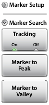 ![]() | Marker Search Tracking (On Off) When turned On, the active marker becomes a tracking marker and defaults to tracking the peak. To track Valleys, press the Marker to Valley button after turning on Tracking. The Search settings can all be applied to a Marker with Tracking either On or Off. Marker to Peak Places the currently active marker on the highest signal amplitude currently displayed on screen. Marker to Valley Places the currently active marker on the lowest signal amplitude currently displayed on screen. |