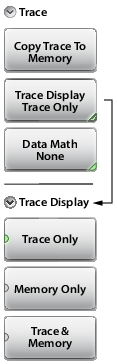 ![]() | Trace Copy Trace to Display Memory Copies the current trace display to memory for use in Trace Math and Trace Display options. Trace Display Press to change the display options. Data Math Press to change the trace math options. Refer to Trace Menu (continued). Trace Display Trace Only The active trace is displayed (yellow). Memory Only The trace that is stored in memory is displayed (purple). Trace & Memory If a trace is stored in memory, then the stored trace (purple) and the current active trace (yellow) are both displayed. |