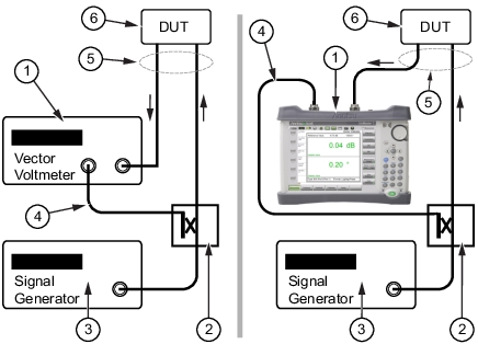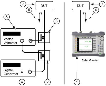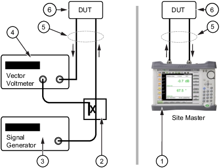 For Reflection or Transmission measurements, the S820E VVM function can replace the entire setup of source, VVM, and couplers, as shown in Figure: Vector Voltmeter Reflection Measurement and Figure: Vector Voltmeter Transmission Measurement. If the measurement setup still requires the use of an external source and couplers, however, then the S820E VVM function can replace only the original Vector Voltmeter by using the A/B or B/A measurement selection. The B/A setup is shown in Figure: Vector Voltmeter B/A Measurement with the traditional Vector Voltmeter instrument method (left) and the equivalent measurement using the Site Master in VVM mode (right). For these measurements, the reference signal is received on one port of the S820E (Port 1 for B/A and Port 2 for A/B) while the signal transmitted through or reflected from the DUT is received on the other port.