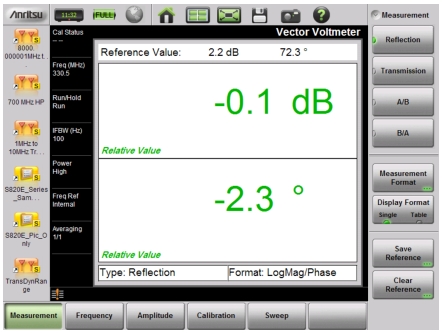 5. As shown in Figure: Relative Reflection Measurement, the current measurement is saved and displayed as the Reference Value (at the top of the VVM display). The displayed values are now relative to the saved values, which are the difference between the current measurement and the saved reference. In other words, saving a reference will normalize the results to the current measurement.