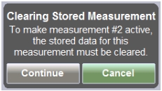 When you press Enter on a saved row, a message is displayed (see Figure: Message – Clearing Stored Measurement). In order to make the measurement row active, the stored data must be cleared. Press the Continue button or the Cancel button.