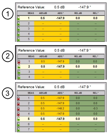 Begin the measurements and save a reference (if needed). The measurement results are displayed in the top row of the table. Press the Enter key to save a measurement and move to the next row of the table.