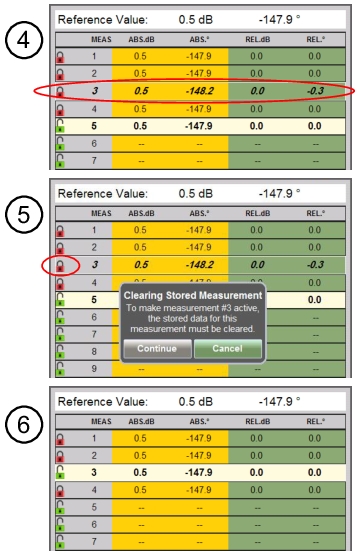 Row 3 is active and highlighted. The data that were in Row 5 prior to making Row 3 active are not saved because it was not locked in. After new data are locked in Row 3 by pressing the Enter button, the active measurement drops down to the next available row in the table. In this case Row 5 becomes active again. See Step 7.