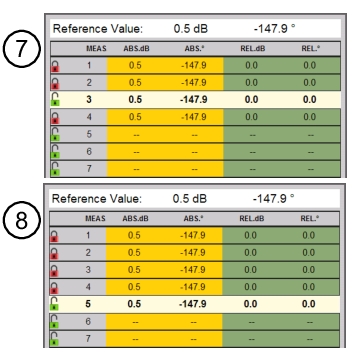 In the example shown in Figure: Table Display Format, multiple tuning stubs are being measured and compared to a reference stub. Tolerance was specified as < ± 0.1 dB and < ± 2° compared to the reference. From the results you can see that stub numbers 4, 5, 6, and 8 fail the tolerance, but numbers 1,2,3 and 7 pass.