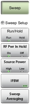 ![]() | Sweep Run/Hold Run Hold: Default is Run. Press this submenu key to toggle the sweep setting between Run and Hold. Hold stops the active measurement and holds the current measurement results. Run restores the active measurement and continuously updates the active measurement results. RF Pwr In Hold On Off Press this submenu key to toggle RF power On or Off while the sweep is set to Hold. Source Power High Low Press this submenu key to toggle the internal source power setting to High power or Low power. IFBW Press this submenu key to display the IFBW dialog box (see Figure: IFBW Dialog Box) and select a bandwidth. Choose from: 100 kHz (maximum sweep speed) 1 kHz 100 Hz (default) 10 Hz (maximum dynamic range) Sweep Averaging Press this submenu key to enter the number of sweeps to use for averaging. Use the Up/Down arrow keys, the rotary knob, or the number keypad. The setting range is 1 to 1000. |