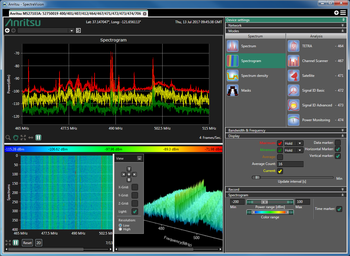 Figure: SpectraVision User Interface is an example of the SpectraVision User Interface. It includes the measurement display and Device Setting panels on the right of the UI window. Depending on the mode selected, other panels or graphs will display under the measurement display. In this example it shows the 2-D and 3-D spectrogram of the measurement.