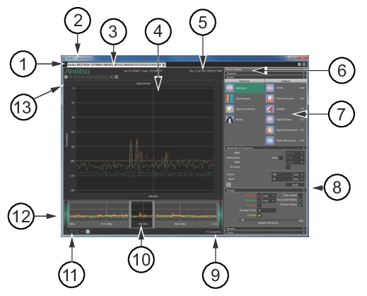 After connecting to a device in the Network Panel, its signal is displayed in the main window and its device name in the tab above the main display. When connected to multiple devices, each tab displays the name of the device connected that it is connected to. The active tab is highlighted white and the inactive tabs gray. See Figure: SpectraVision User Interface.