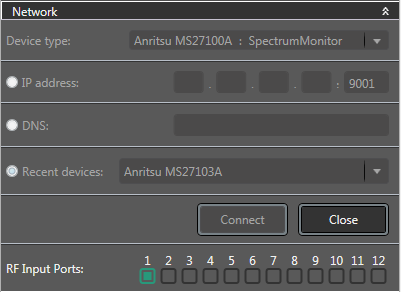Recent Devices | A pull down list of recently used spectrum monitors or demonstration signals. |