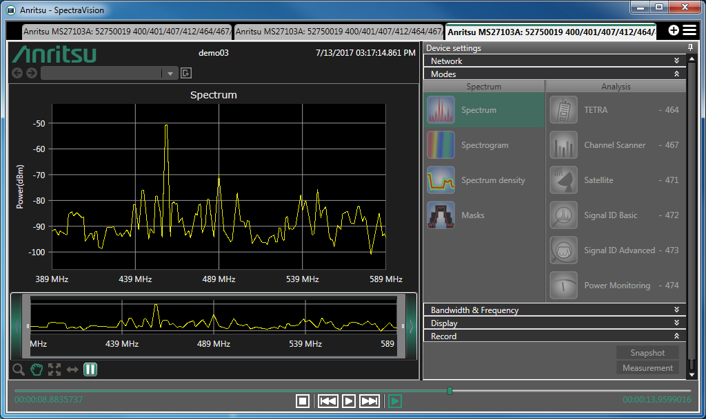 If you want to play a measurement, double click the item in the list or select the item and click “Load”. The selected recording opens in another measurement window with the name of the recording on the title bar. The corresponding mode and a replay bar at the bottom of the view shows up (Figure: Recording Replay Display). It is possible to play the entire measurement or jump to specific positions by modifying the replay slider. The device tab title will include the word “Offline”. Device settings are generally disabled for “Offline” devices. Possible user interactions include adding markers, moving the spectrum mode specific zoom window or activating minimum or maximum hold.