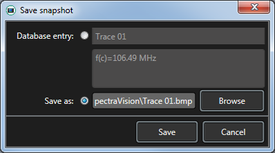 You can store the snapshot into the SpectraVision database. This snapshot can be reviewed at a later time. See the Review Records section below for information on viewing snapshots and recorded (video) measurements within the SpectraVision application.