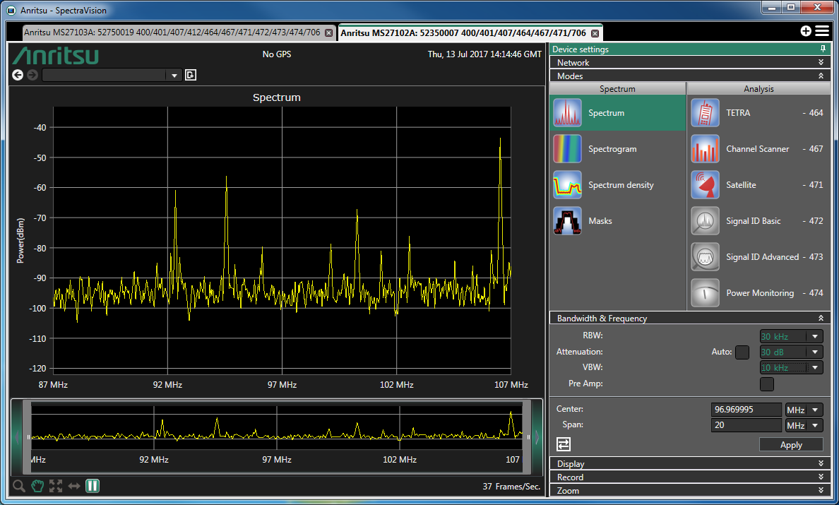 Weak input signals can be displayed only if the RF Gain control is set to the minimum. If the RF gain step is set too high, weak signals are superposed by amplified noise of the RF stage. A measurement of FM signals recorded at lowest gain step is depicted in