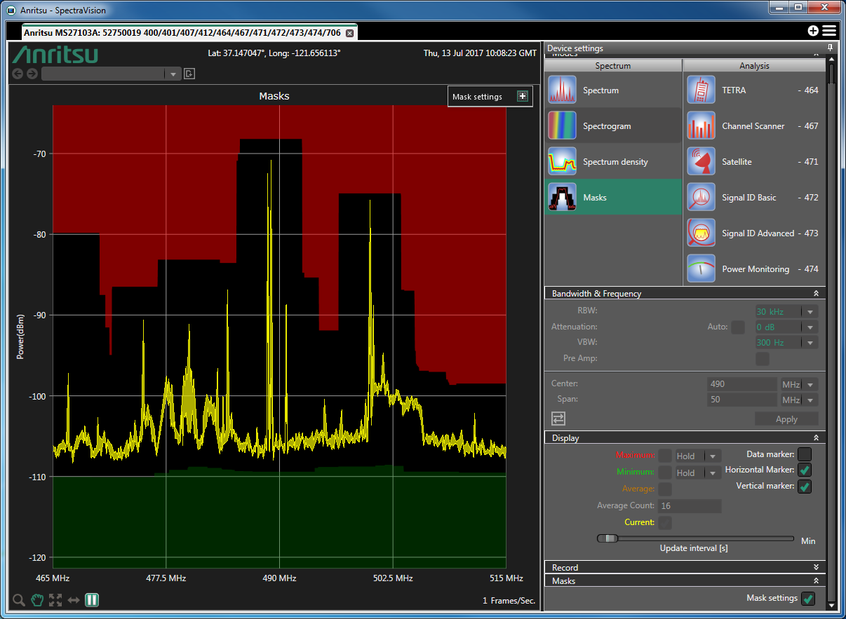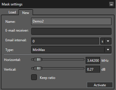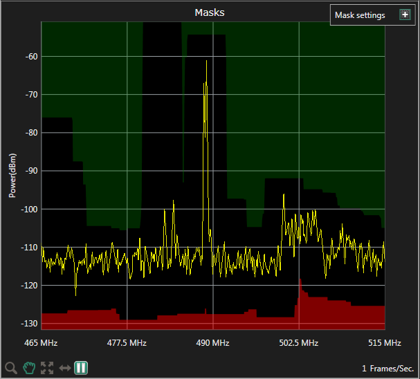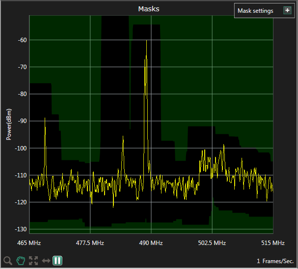 The Masks feature is used to trigger alarms by defining a certain mask in the spectrum. This can be done by various types of masks. After defining and activating a mask it will recognize every hit by the spectrum and fire the alarm.