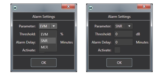 • SNR - alarm set when Signal-to-Noise Ratio falls below a certain user-settable threshold.