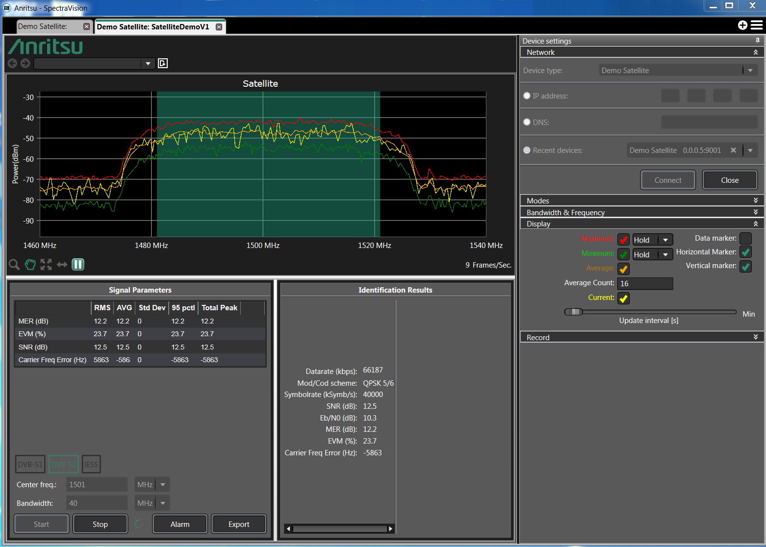 Demodulation parameters such as data rates, modulation/coding schemes, SNR, MER, EVM, etc can be quickly provided on a satellite signal of interest. A unique feature of the analysis feature is the recording of important signal parameters as a moving average over time. Measurements such as MER and EVM are evaluated for trends. In this way, any developing degradation of the signal can be evaluated before it becomes a major problem.