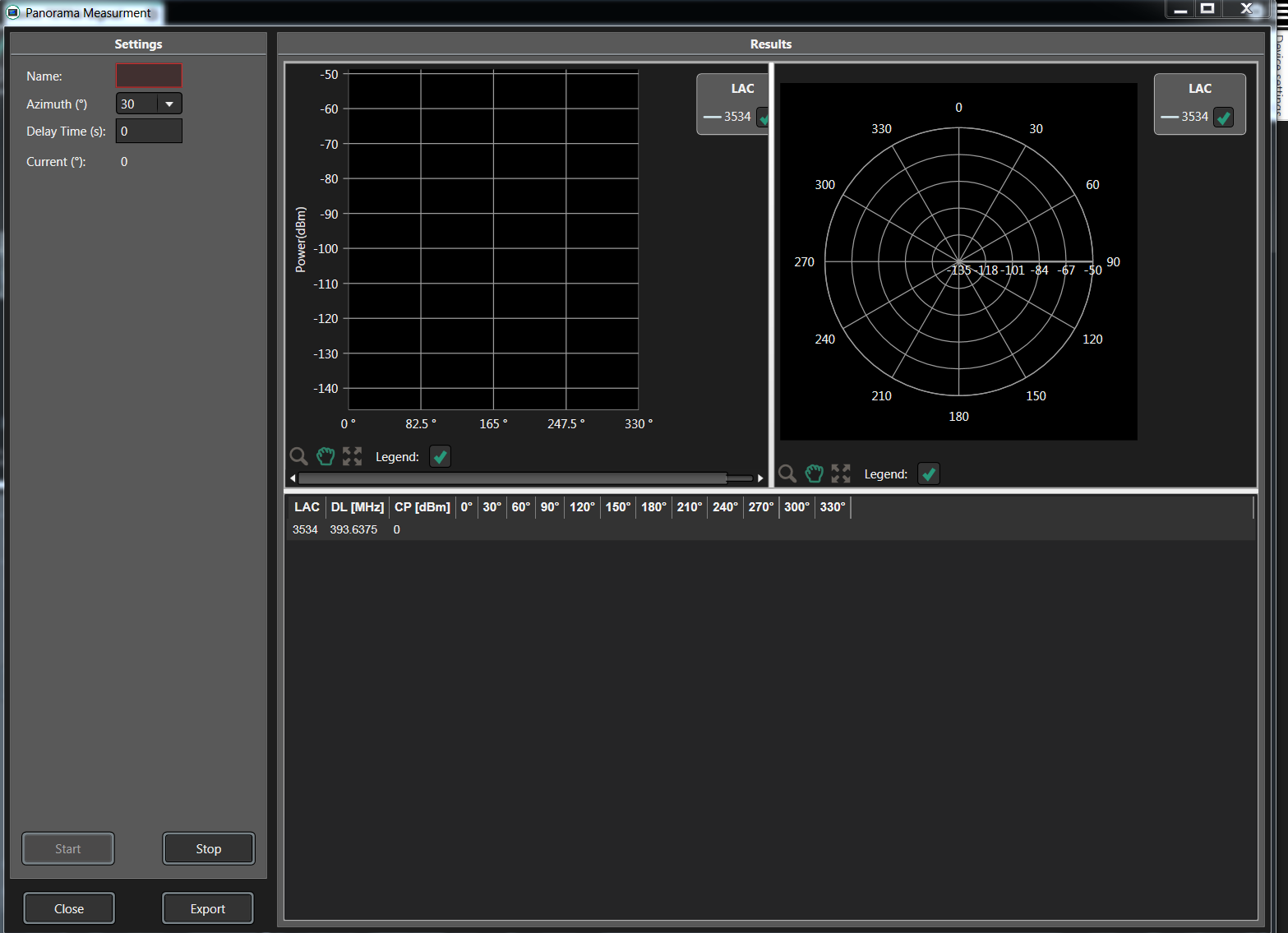 Clicking on the Panorama button at the bottom the Identification windows will produce a new window. See Figure: Tetra Window - Empty Panoramic View below. The Panorama Measurement allows users to measure and record power levels according to a specific Location Area Code (LAC). The field strength of the TETRA carrier as well as all neighborhood cells is recorded. The data is stored in dBm units (along with the location coordinates) as a directional antenna is swept across a 360 degree circle.