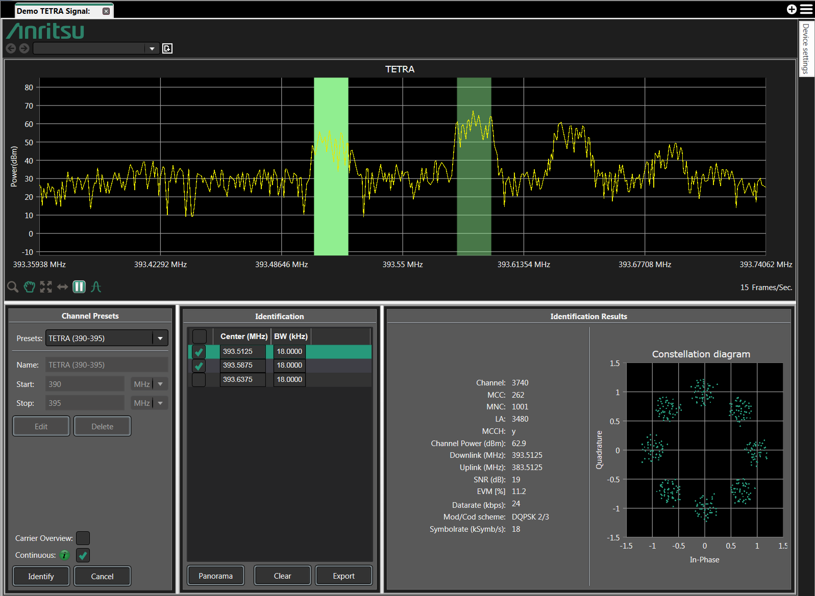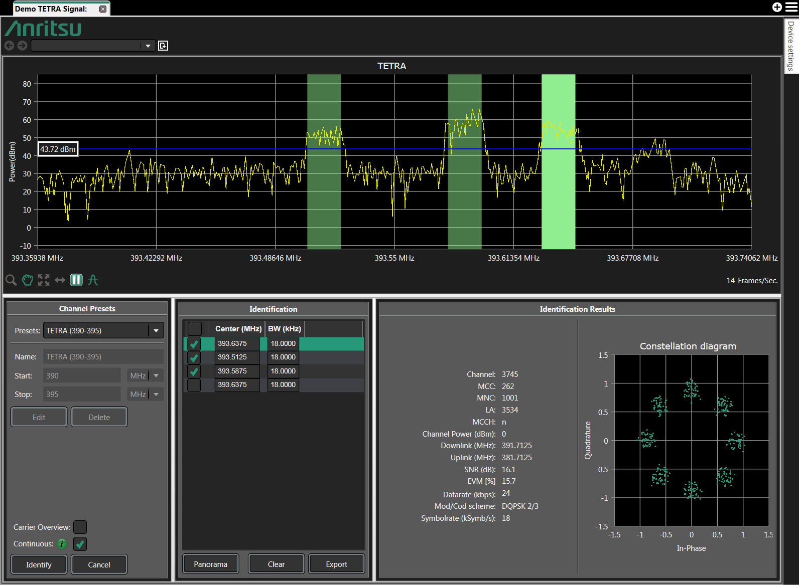 Checking the box to the left of each Center frequency will enable a colored rectangle to appear on the TETRA spectrum screen. Clicking inside the box to the right of the Bandwidth column will cause the Identification Results to appear in its respective window. Signal demodulation parameters and a Constellation Diagram will appear in this window for the TETRA signal selected.