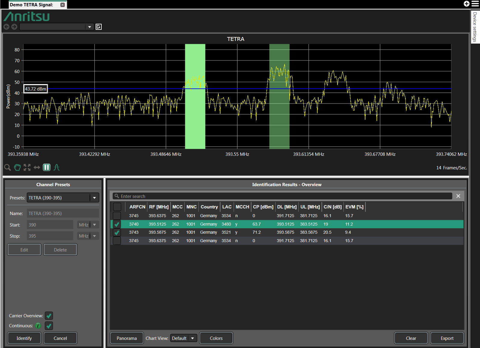 The Carrier Overview selection will display a window called 'Identification Results - Overview' to be displayed. Here you can see a listing of all signals captured in the scan with signal parameters such as ARFCN, RF frequency, MCC/MNC codes, EVM percentage, etc. Selecting the 'Colors' button allows users to color code the scanned TETRA signals according to the country of origin.