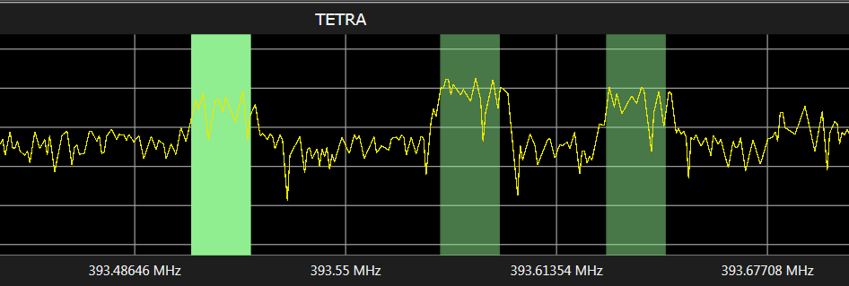Please use the correct offset frequencies allocated for your country. Users can also observe a TETRA signal on the trace window. When the proper offset is selected, a green rectangular box will be centered on the TETRA signal. See Fig XYZ where a 12.5 kHz offset has been applied.