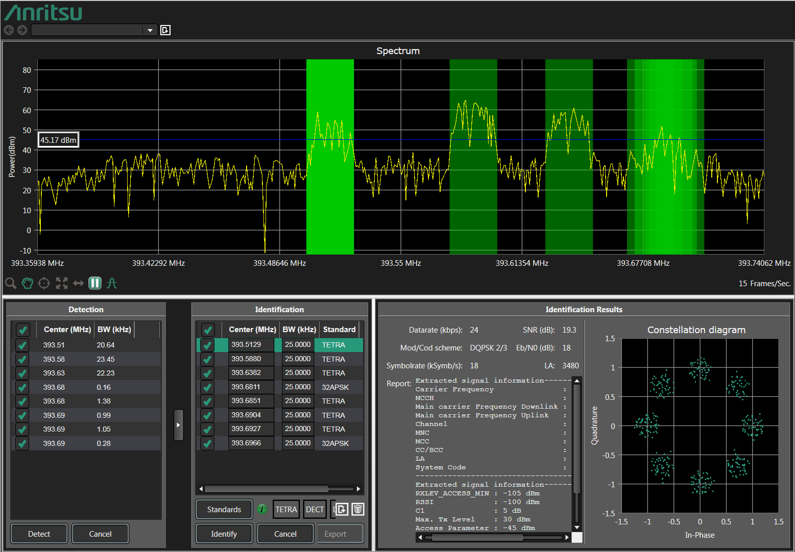 Detected carriers and identified standards will be displayed here. Additional information and a constellation diagram are also shown if available. Users can show results for various signals by clicking on the associated frequency in the Identification window. The signal that is highlighted in green is used for the Identification Results window.